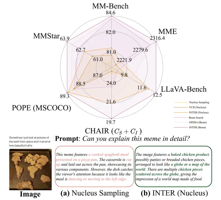 Results of INTERHallucinations in large vision-language models (LVLMs) pose significant challenges for real-world applications, as LVLMs may generate responses that appear plausible yet remain inconsistent with the associated visual content. This issue rarely occurs in human cognition. We argue that this discrepancy arises from humans’ ability to effectively leverage multimodal interaction information in data samples. Specifically, humans typically first gather multimodal information, analyze the interactions across modalities for understanding, and then express their understanding through language. Motivated by this observation, we conduct extensive experiments on popular LVLMs and obtained insights that surprisingly reveal human-like, though less pronounced, cognitive behavior of LVLMs on multimodal samples. Building on these findings, we further propose INTER, Interaction Guidance Sampling, a novel training-free algorithm that mitigate hallucinations without requiring additional data. Specifically, INTER explicitly guides LVLMs to effectively reapply their understanding of multimodal interaction information when generating responses, thereby reducing potential hallucinations. On six benchmarks including VQA and image captioning tasks, INTER achieves an average improvement of up to 3.4% on five LVLMs compared to the state-of-the-art decoding strategy.
